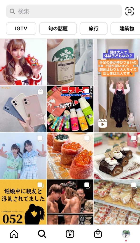 こちらの発見タブでは、まだフォローしていないアカウントがInstagram側からオススメされて表示されるようになっていたり、自身の興味関心やInstagram内で取ったアクションをもとにInstagram側がオススメするアカウントが決定されています。
