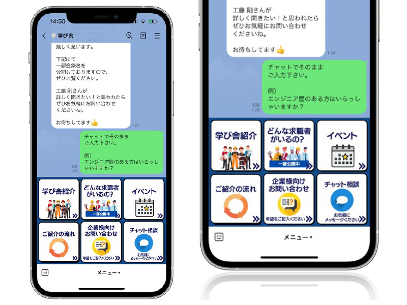 BtoB向けLINE公式アカウント 求職者の紹介をするためのアカウント メール、メッセンジャーなど発信媒体がバラバラだったため LINE公式アカウントに一括管理としました。 ●LINE公式アカウント制作